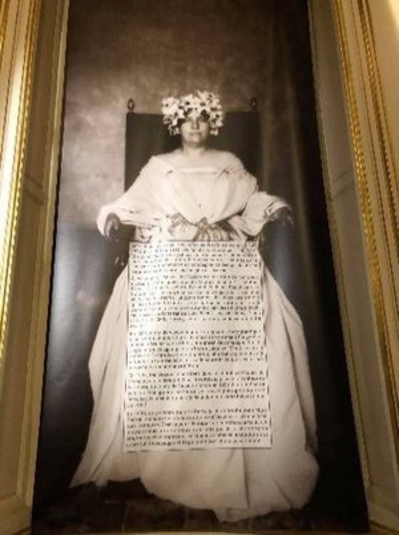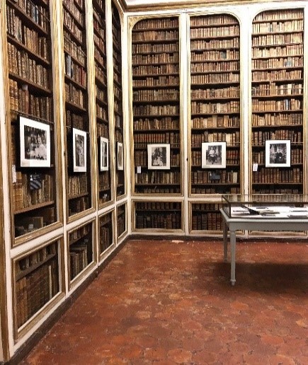 En effet, ce lieu chargé d'Histoire est fascinant tant par sa décoration blanche et or, que par les ouvrages anciens et de grande valeur qu’il abrite. Une fois à l’intérieur, nos yeux ne savent plus où regarder. Je suis moi-même distraite par cette architecture impressionnante et sublime, à en oublier presque la raison principale de ma venue. Mais très vite, le regard impérial de J. de Vasson assise sur son trône, couronne de lys sur la tête, se pose sur nous et c'est parti pour une immersion dans le quotidien de cette pionnière de la photographie.