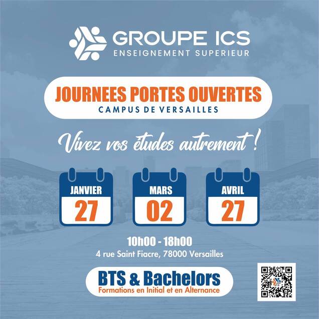 Spécialiste du BTS et Bachelor sur Versailles depuis 1992, le Groupe ICS vous accueille à l'occasion de ses Journées Portes Ouvertes les samedi 27 janvier, 02 mars et 27 avril de 10h à 18h. Venez découvrir l'établissement à taille humaine et échanger en toute convivialité avec les étudiants sur vos questions d'avenir et de poursuite d'études. Des événements à ne pas manquer pour envisager de vivre vos études autrement !